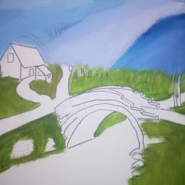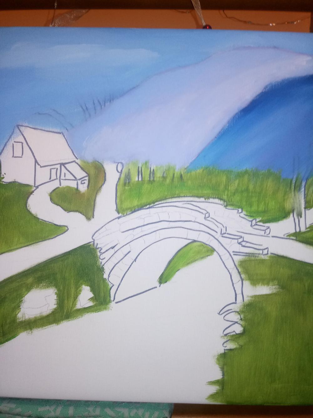 Vasárnap van időm festeni. Amikor befejeztem az egyik képet, fogtam egy lapot és egy régi képemről a képernyőről átmásoltam rá az öreg hidat. Utána a vászonnal és az indigóval kimentem az erkélyre, hogy átrajzoljam a vászonra. A madarakat folyamatosan etetem. Vannak gömbök és van szottyi is. Az asztalon, a gázkonvektor szellőzőjénél van nekik víz, ahol nem fagy be. Ott rajzoltam, amikor meglepetésemre megjelent egy cinege és inni kezdett. Tőlem húsz centire.